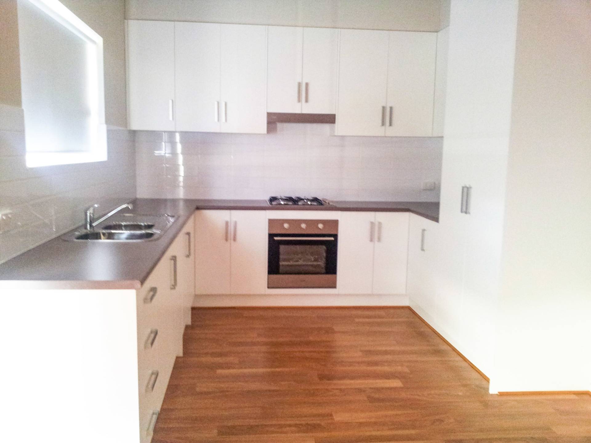 • Kitchen with ample cupboard space and gas cooktop overlooks the rear yard